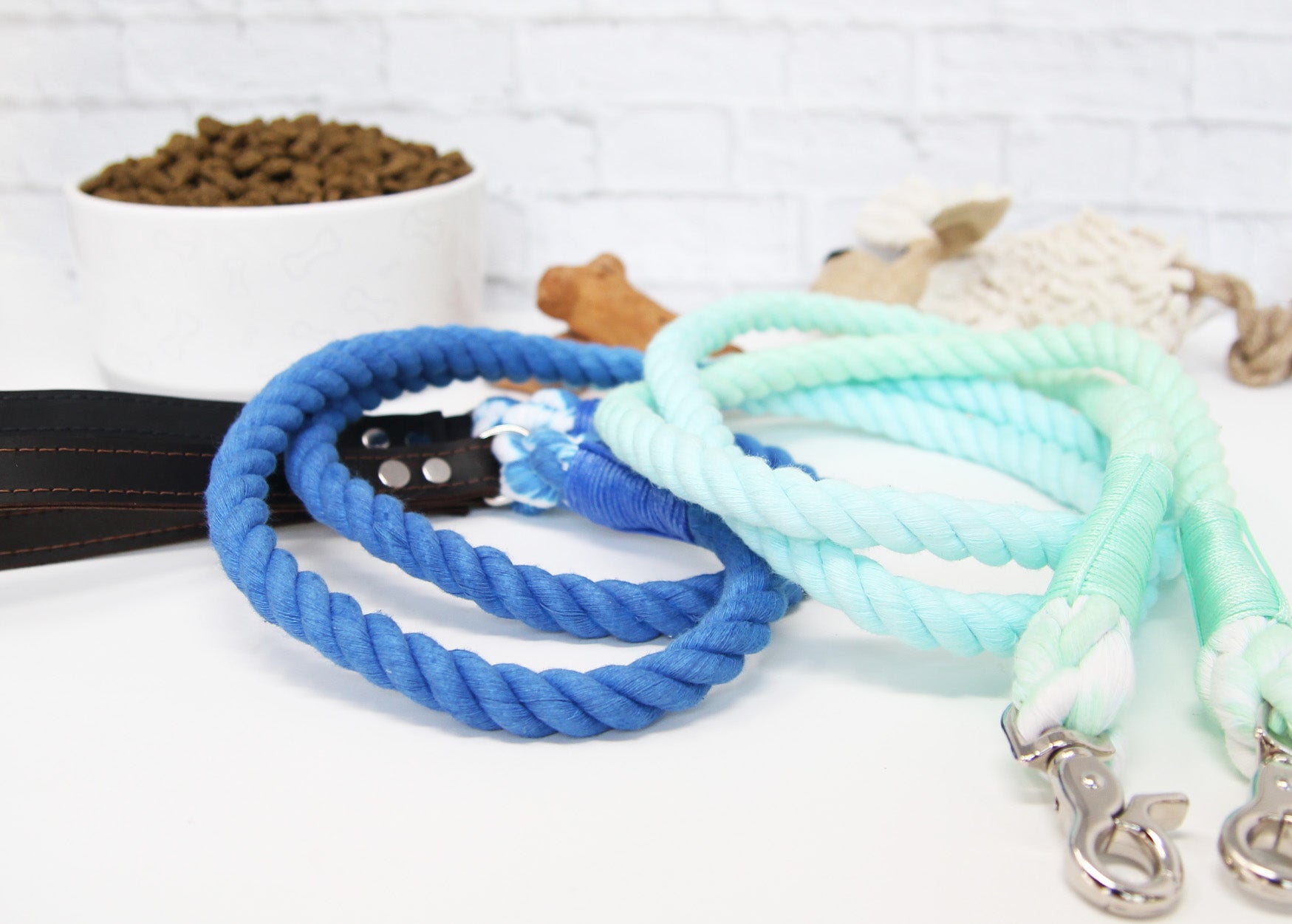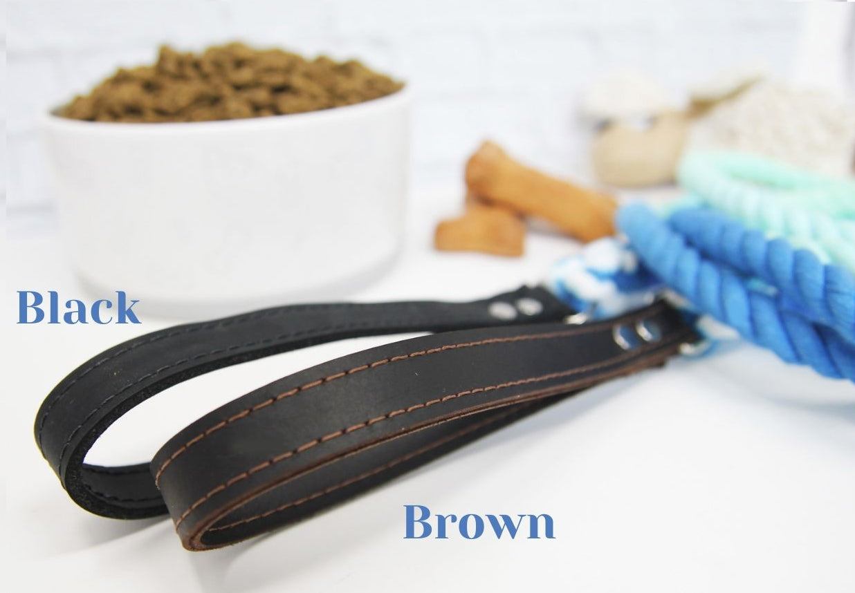 This beautiful ombre rope leash can be made with a black or brown leather handle. We designed this leash with comfort in mind, our premium leather handles provide comfort with strength which provides an attractive result.